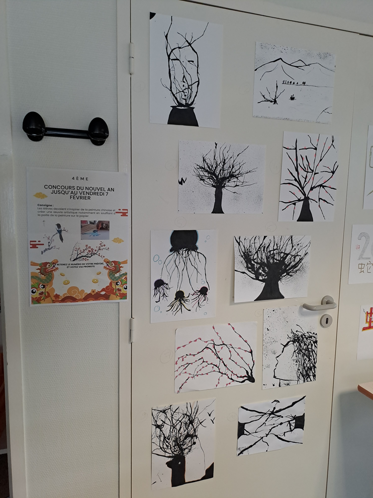 Chaque niveau a participé à un concours : carte de vœux pour les 6è, papier découpé pour les 5è, peinture soufflée pour les 4è et dessin sur le thème du lapin pour les 3è. Leurs œuvres ont été exposées au CDI et les élèves du collège ont eu jusqu’au 7 février pour les voir et voter pour leur préférée, le prix des élèves a été décerné dans chaque classe grâce à eux. Les résultats sont en ligne sur le site : http://clg-pierre-de-ronsard-tours.tice.ac-orleans-tours.fr/eva/spip.php?article231