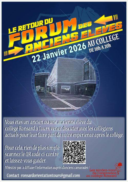 Le collège Ronsard organise un nouveau forum des anciens élèves le jeudi 22 avril 2026 en fin de journée. C’est l’occasion pour les anciens de venir parler à nos élèves actuels de leur parcours.